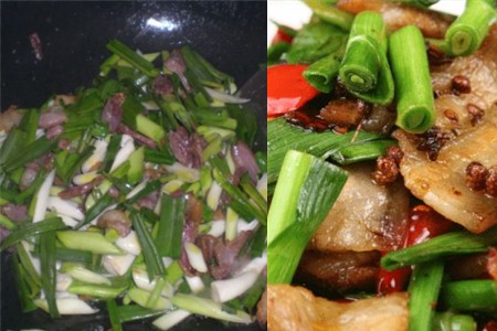 准备工作做好后,起火热锅放油,下腊肉爆炒。当腊肉出油后,下大蒜炒。大蒜易熟,一般拌炒三四分钟即可。辣椒在收尾时放,稍加翻炒即可。