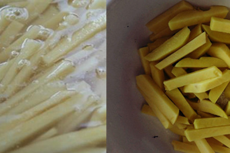 我们首先将薯条切好放入水中浸泡。这样做的目的是将土豆表面的淀粉冲洗干净,让做好的土豆更加酥脆。烤土豆需要干燥的土豆,所以在浸泡完成后,需要将土豆条捞出,放在一旁等待滤干水分。也可以用餐巾纸包裹吸收水分。