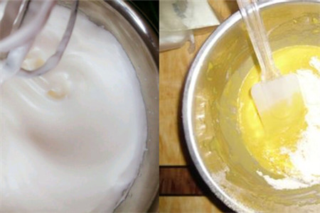 取三分之一的蛋白加入到面糊中,上下翻动拌匀。将剩下的蛋白倒入,继续上下翻动。