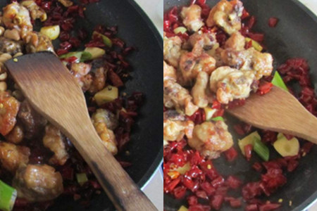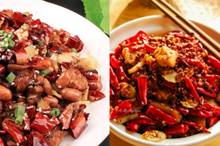 辣子鸡丁是一道有名的川味名菜。一盘盘辣子鸡丁点上面都覆盖了一层又一层厚厚的辣椒段,需要在辣椒段中慢慢寻找你想要的鸡丁。
