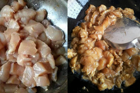 1、鸡丁切成小块。冷水将鸡肉放入锅中烧开捞出沥干备用。