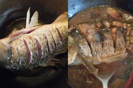 准备就绪后,起火热锅下油,下鱼煎。这时候,油可不能省。直到鲤鱼两边煎到金黄,才算成功。之后把鱼捞起来,继续下油,下碎姜,下辣椒,爆炒出香味后,加水,下鱼。盖上盖子,焖煮个五六分钟。