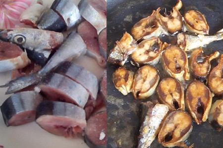 第二,在锅中倒入油,等到温油达到7分时放入秋刀鱼段。过程中需要小火煎炸,这样可以保证秋刀鱼的皮不会破掉。两面煎的金黄的时候就可以拿出来放旁边备用了。
