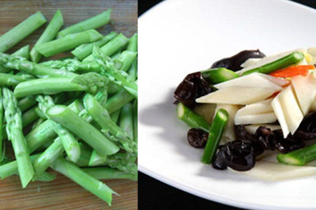 芦笋炒山药也是比较常见的搭配,口感青脆香甜,而且营养丰富均衡。将山药去皮斜切成片,芦笋切成片状。一般人都会再加入少量木耳,所以要提前十五分钟把黑木耳用温水浸泡。