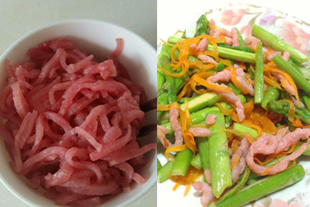 然后热锅加入肉丝煸炒,等到猪肉变硬即可倒入少量的酱油,既上色又提鲜。因为芦笋炒肉丝这道菜口感是偏清淡的,所以千万不要放花椒八角煸炒。