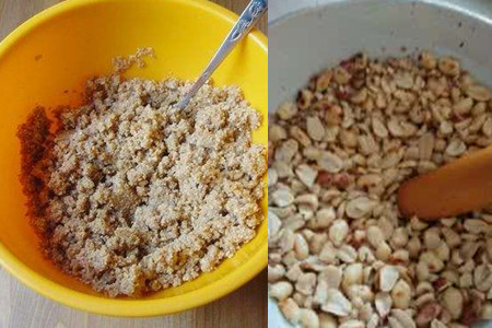 接着要准备的是馅料。以花生汤圆为例,买半斤左右的花生、适量砂糖和猪油。将花生炒熟,去掉花生外衣,放进碾磨器里,碾磨成粉状后再加入猪油一起搅拌均匀。
