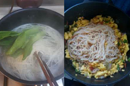 接下来要做的就是耐心等待面条煮熟。之后我们就可以把烧好的面条捞出来放到碗里,同时将之前做好的西红柿蒜苔以及切好的黄瓜丝放进去。这样,一道美味的食物就做好啦。【女物原创未经允许,谢绝转载!】