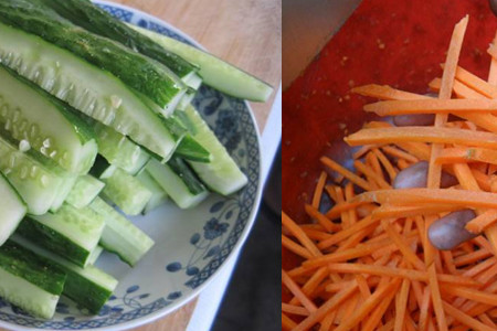 ⑥等到差不多的时候把黄瓜和番薯条一起倒入,青菜是最后放入的。以上就是麻辣虾火锅的做法,看起来步骤可能有点多,但在休闲的时候自己动手做也是一种生活享受!【女物原创未经允许,谢绝转载!】