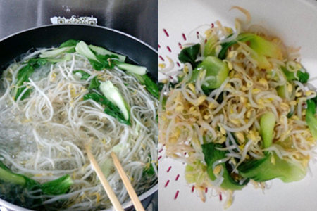 第三步:将适量的清水放入干净无油的锅中,等待水烧开水,加入一茶匙的盐,再放入面条。煮面条一直煮到面条只剩下白芯之后,放入已经准备好的干净的小白菜和豆苗。等待锅中的清水再次沸腾的时候,将锅中的所有食材捞出来,用干净的碟子装好。