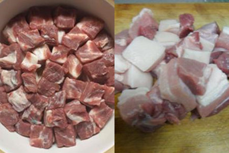 第二步:先烧开一锅清水,然后放入清洗干净的五花肉,淖水之后捞起来,清洗干净。将五花肉切成差不多的大小,放入一个干净的容器中装好。然后,加入一茶匙的盐,两茶匙的料酒,一茶匙的鸡精,一茶匙的老抽,一茶匙的生抽,搅拌均匀,放置一边腌制,待用。
