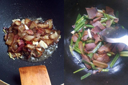 第五步:直接在刚煮过腊肉的锅中,依次放入生姜丝,葱花,蒜末,爆香之后,再放入蒜芯。蒜芯炒熟之后,放入煮好的腊肉,爆炒之后,盖锅关火。用余温等待两分钟,最后装盘出锅即可。【女物原创未经允许,谢绝转载!】