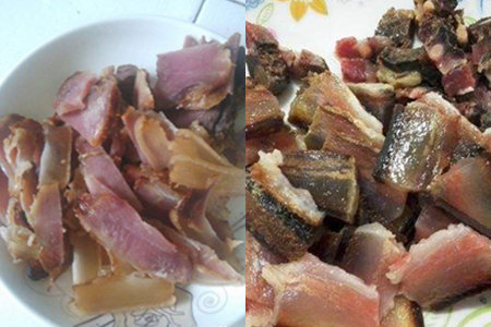 第二步:将腊肉用热水去掉表皮的杂质,切成薄片。清洗干净蒜芯,并且切成3公分的长度,用筛子装好,放置一边待用。