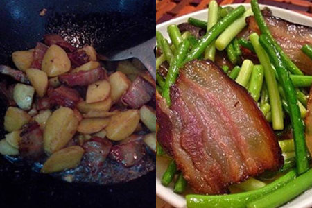 第一道菜式是腊肉炒豆角。第一步:需要准备食材,主材料是400克的腊肉一条,豆角250克,生姜两片,葱两根,蒜头两瓣。辅助材料是食用油,盐,料酒。