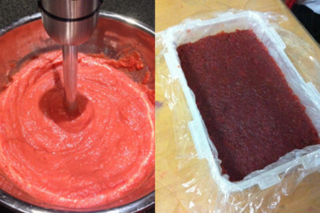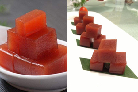 第五步,也是非常关键的一步,山楂糕凝固成型得是否完美,就看这一步了。一边往山楂的浆体里加入琼脂,一边进行搅拌,一定要保证琼脂完全均匀地分布在山楂里。琼脂的用量各个品牌会有所差别,一定要按照包装说明上的量使用。
