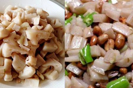 第二道是花生米炒藕丁。这道菜的特色在于花生米和藕丁的双脆口感。需要先把花生米翻炒至变色后,捞起让其冷却,然后再炒藕丁,等藕丁炒好以后把花生米到进去混合一下就可以了。花生米先进行冷却的目的就在于让它变得酥脆。