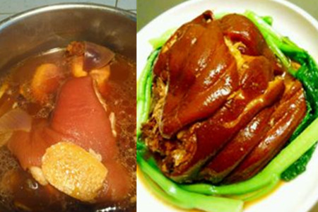 首先,将浸泡好一个小时的猪肘放入放入锅中中火烧开,焯掉一遍血水。把焯过水的肘子取出,用水冲凉。用镊子除去肘子表面的细毛,再用牙签在肘子表面扎几下。