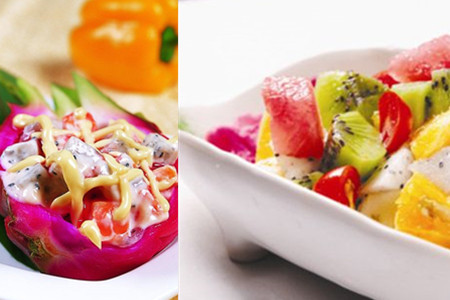 大家都知道水果沙拉吧,火龙果可是很适合的一种水果。因此也可以加上其他的水果,在放上沙拉酱,就变成了一份美味消暑的食物。除此之外,它也可以用来制作寿司、火龙果奶昔、或者配上酸奶食用,都是很不错的食用方式。不过没吃过的人看到里面的籽也不用怀疑,籽是可以食用的。
