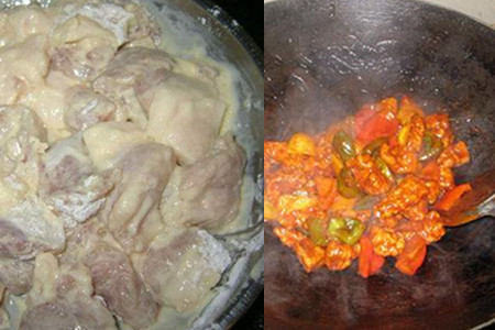 再把腌制好的猪肉和鸡蛋还有面粉一起搅拌均匀,保证每块肉上都有浆糊。