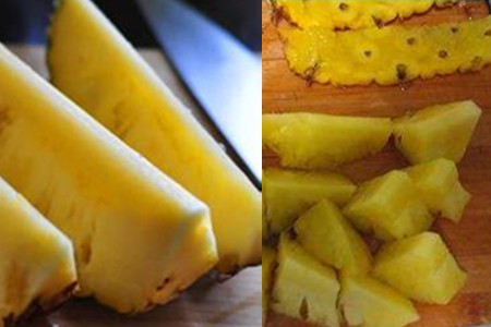 4、也可以用另外一种方法处理,把切完的菠萝瓣上面再切出无数的小块,再把果皮片下去,再把这些小块的菠萝眼去掉。【女物原创未经允许,谢绝转载!】