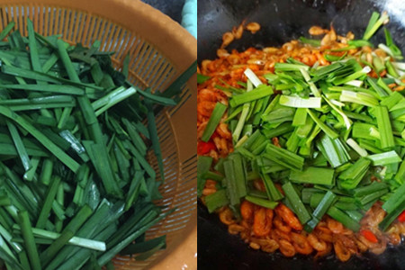 再把切好的韭菜也放进去炒均匀,大概需要两三分钟的时间韭菜才能熟。