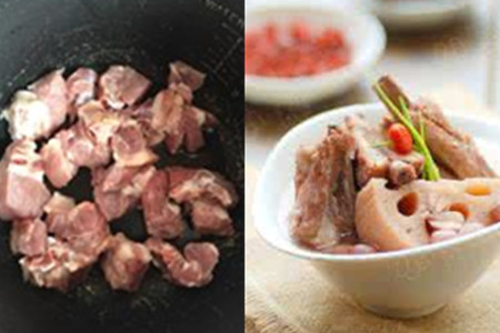 首先,将花生事先放在水中浸泡两个到三个小时。莲藕洗净,特别是莲藕节方面会有很多的泥沙,所以可以用小毛刷刷洗干净。处理干净后,把莲藕切成大丁块。