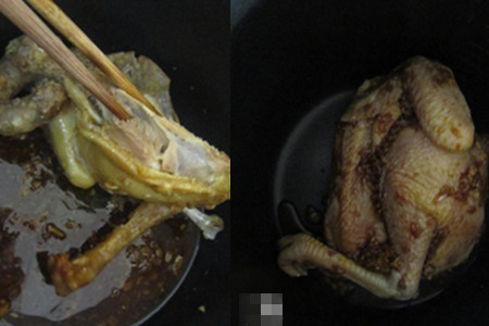第三步,进行对鸡肉的处理。将这些酱汁倒入锅中并加入水(没过鸡的一半),再熟的过程中要不停反转鸡肉。(还可以事先将鸡肉用高压锅炖至软烂,这样速度更快,口感更好)当鸡肉完全熟透以后,就可以在进行下一步了。