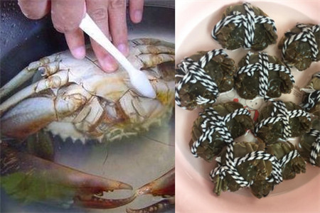 2.在蒸之前可以到点白酒在螃蟹上腌制下,这样味道会更好些。还有记得要用绳子把螃蟹的脚给绑住(也可以用稻草来捆住整个螃蟹,这样味道更佳清香),不然在蒸的时候螃蟹的脚会掉出来,这样蟹黄和蟹油就会流出来。