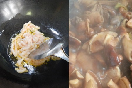 炒至两三分钟后,添水。水一定要没过食材,把香菇放下。盖上盖子,大火焖煮。这个焖煮的过程有点长,先是大火猛攻,然后是小火慢炖。保守估计,至少要半小时。