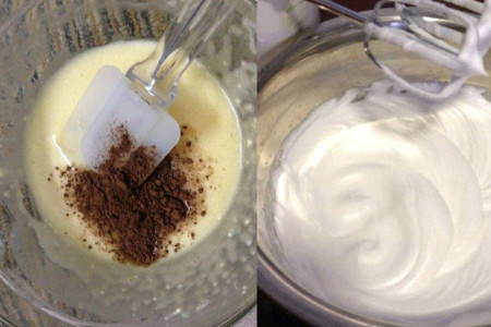 用刮板把打好的蛋白刮出一点加入到巧克力酱中,均匀混合在一起。