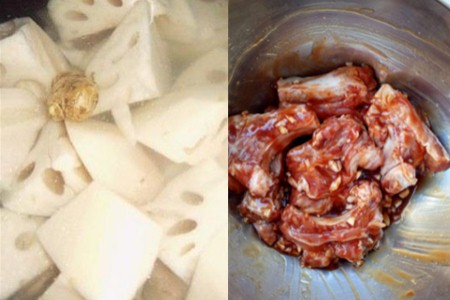 首先,准备好原料。一斤排骨,几根莲藕,一小把枸杞和几粒红枣。排骨洗净焯水,莲藕洗净切段,红枣和枸杞用温水浸泡。