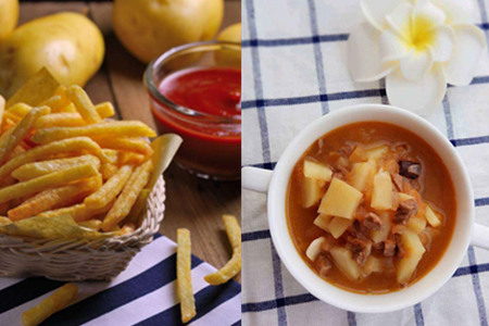 番茄和土豆最常见的吃法就是薯条和番茄酱。这样的搭配方法是很多人从小吃到大的,虽说不是一道菜肴,但也是休闲时刻一种让人嘴馋的小零食。现炸的薯条配上酸酸甜甜的番茄酱,之前薯条清脆的口感立刻变得丰富起来。