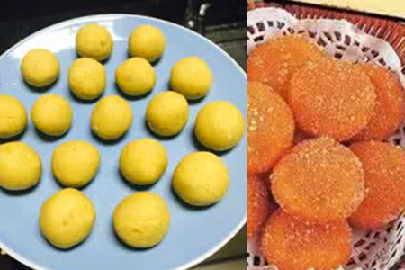 接下来,将已经软烂的地瓜块放入碗中,再用趁手的工具将其捣烂,并与面粉和适量白糖和在一起搅拌均匀。待到地瓜面完全被搅拌得细腻、均匀之后,你就可以把面团分成适当大小的小块,再搓成小球、压成饼状。此时如果你准备了黑芝麻或者红豆沙馅料,就可以把馅料也包进去。