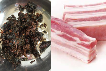 首先,将梅菜事先用清水浸泡,多次清洗洗净其中的杂质颗粒。把葱、姜切成片状。选用肥瘦相间的五花肉,把它处理干净。把五花肉放入锅中,倒入适量的清水河葱姜片、桂皮、八角、料酒,大火煮沸后改为小火炖煮。