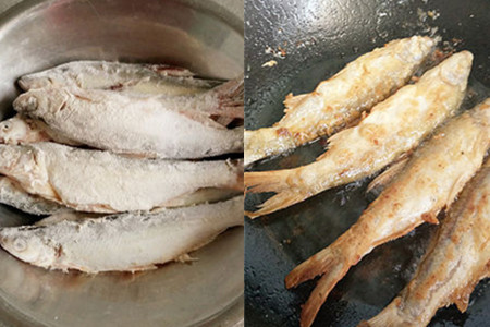然后,开大火将锅烧热后倒入适量的油,待油烧熟后将白条鱼沿着锅边慢慢的放进油中煎。将火关小,将白条鱼油煎至鱼身变得金黄色就可以起锅。其他几条鱼也这样。