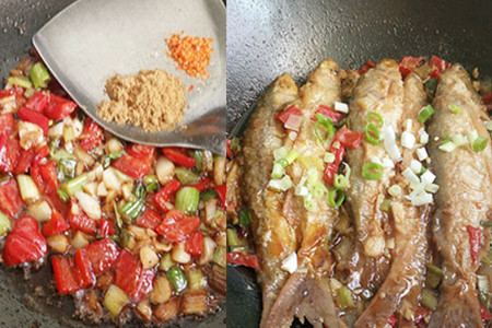 最后,开始烧鱼。开大火烧油,加入红辣椒、葱和蒜炒熟,加入适量的盐、酱油、花椒粉、辣椒粉和香叶等作料翻炒后,将煎好的鱼放入,并加入适量的清水、醋和料酒。水烧开后就将火关至小火煮鱼,待鱼汤干后就可以关火了。将鱼起锅装盘,撒上葱花。【女物原创未经允许,谢绝转载!】