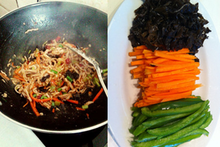 4.开始炒菜。大火将锅烧热,在锅纲要冒烟时倒入小半碗冷油。油8分热时下肉丝,当肉丝快要断生时加入葱姜蒜末、泡红椒和豆瓣酱爆炒,然后与肉丝充分混合后迅速加入胡萝卜丝、木耳和青椒丝继续翻炒。