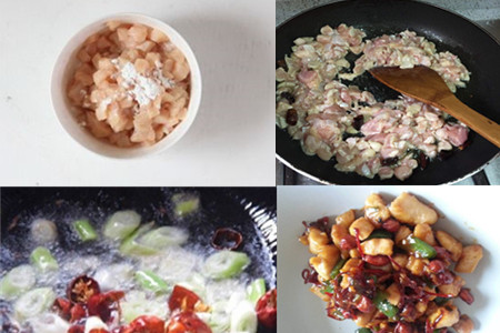 将鸡肉拍松散,切成小丁并用盐和酱油还有淀粉上浆,搅拌搅拌去腥。热锅之后倒入油,用热油将鸡肉炒制,直到鸡肉变色的时候捞出。注意一定要保持翻滚,让肌肉均匀受热,所以炒制鸡肉的时候一定要翻炒。