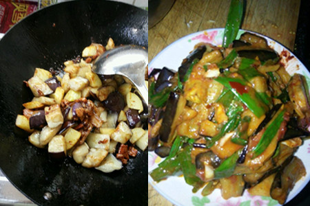 第四步:锅里放油烧热,茄子非常吸油,所以油可以放得比炒其他菜时多一些。先放辣椒下去,迅速翻炒,然后下茄子,翻炒至茄子变色以后,加蒜,花椒,少量白糖,混合均匀。