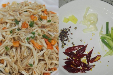 第二个要分享的就是本人非常偏爱的爆炒金针菇。将锅烧热之后加入食用油,依次放入姜蒜片和花椒,翻炒两下,开大火然后将金针菇放入,翻炒大约5分钟之后加入红椒丝,盐,味精等,就可以起锅食用了。做法非常简单快捷。