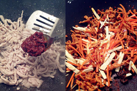 最后就是炒。开大火热油,将里脊肉丝炒至六分熟后,加入适量的豆瓣酱,倒入切好的萝卜丝、笋丝、黑木耳丝大火炒熟。倒入调制好的鱼香汁再炒一分钟就可以起锅了。倒在盘子的米饭上就是鱼香肉丝盖饭。【女物原创未经允许,谢绝转载!】
