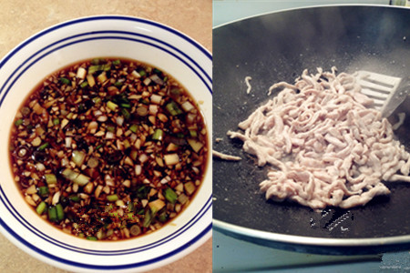 然后,调配鱼香味的源头的鱼香汁。在一定量的水中加入适量的姜蒜末、盐、淀粉、酱油、白砂糖、醋搅拌均匀。
