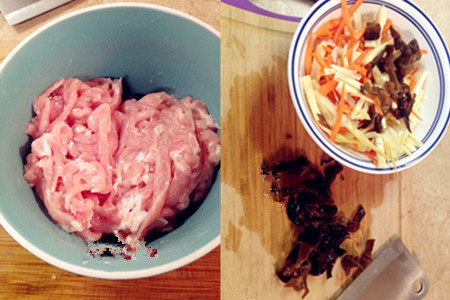 接着,处理食材。里脊肉要切成丝后,用淀粉加料酒、酱油、少许的油捏一下,腌制三十分钟左右。黑木耳要先用温水泡发,萝卜、冬笋和泡发的黑木耳都要切成丝。姜蒜切成碎末。