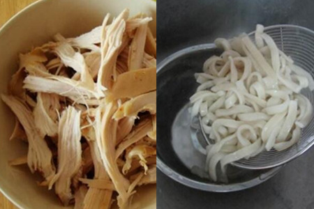 首先,准备一块100g的鸡胸肉,蒸熟后切成细丝。青菜洗赶紧去掉根部,放在一旁备用。