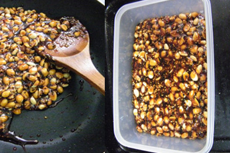 最后,把糖浆连同花生一起捞起,放进容器里,让其自然冷却。为了待会方便切块,容器最好用方形的。