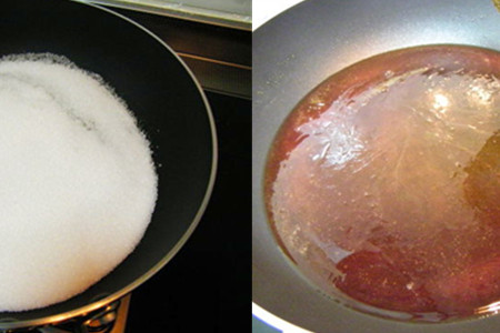 接着我们要开始炒糖。花生酥对糖量的要求是很多的,一碗花生,就至少得一碗白砂糖。把糖倒进锅里,用小火慢慢进行加热,并且用铲子进行翻炒,直到糖完全融化,变成黄黄的糖浆。