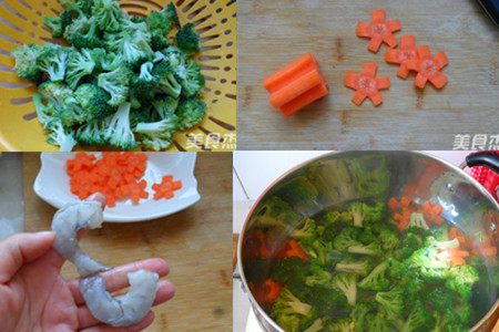 然后,将所有的主食材都进行焯水。开火将水烧开,放入少许的盐,将洗净的西兰花和胡萝卜倒入锅中煮一分钟后捞出来过凉水后沥干;再将虾仁倒入开水中焯一分钟捞出来沥干。