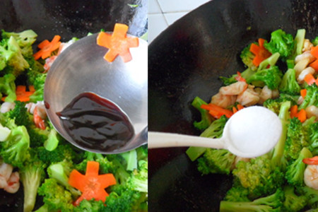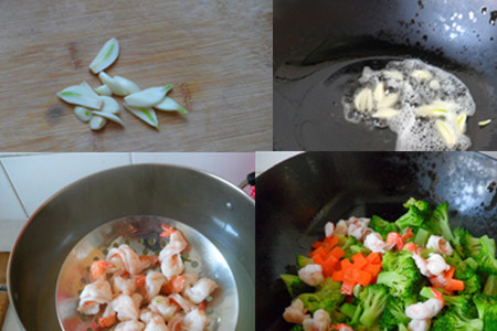 最后,开火放炒锅,将植物油烧熟后,放入姜蒜爆炒,倒入处理好的西兰花、胡萝卜、虾仁翻炒3分钟左右,加入适当的耗油、盐翻炒均匀就可以出锅装盘了。【女物原创未经允许,谢绝转载!】