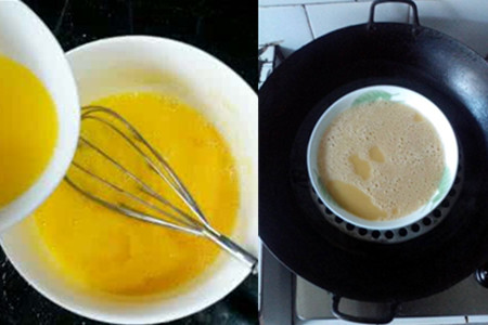 接着,在碗里加上些水。如果比较喜欢吃嫩的鸡蛋羹,可以多加点水。如果喜欢比较硬实的口感,不妨就少加些水。