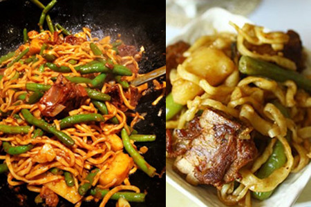 step8:将手擀面均匀地码放在排骨上,锅上锅盖焖至汤干面熟。