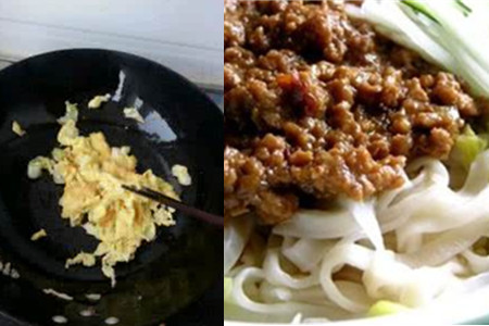 接着,下入之前炒好的鸡蛋,把豆瓣酱和清水放入锅中。这样炸酱就算炒制完成了,把炒好的酱盛在盘中里备用。